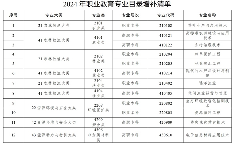 本次新增设的专业重点服务实体经济,特别是面向先进制造业、数字产业发展对技能人才的新需求,新增相关专业占比超过50%。新增的专业中,近半数是职业本科专业,将更好地满足产业升级对高层次技能人才的需求。